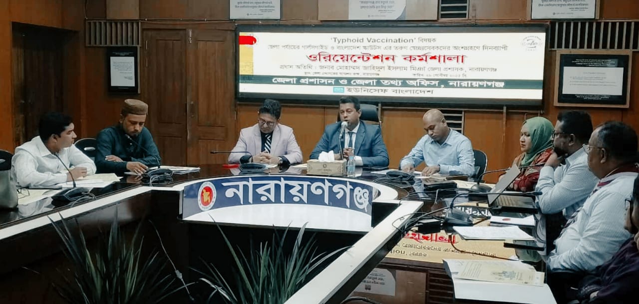 জেলা তথ্য অফিস, নারায়ণগঞ্জ এর আয়োজনে “শিশু, কিশোর-কিশোরী ও নারী উন্নয়নে সচেতনতামূলক প্রচার কার্যক্রম” শীর্ষক প্রকল্পের আওতায় এবং ইউনিসেফ বাংলাদেশ এর আর্থিক সহযোগিতায় জেলা পর্যায়ের গার্লস গাইড ও বাংলাদেশ স্কাউট এর তরুণ স্বেচ্ছাসেবকদের অংশগ্রহণে ‘Typhoid Vaccination’ বিষয়ক ওরিয়েন্টেশন কর্মশালা জেলা প্রশাসকের সম্মেলন কক্ষ, নারায়ণগঞ্জ এ অনুষ্ঠিত হয়েছে। কর্মশালায় প্রধান অতিথি হিসেবে উপস্থিত ছিলেন মোহাম্মদ জাহিদুল ইসলাম মিঞা, জেলা প্রশাসক, নারায়ণগঞ্জ। সভাপত্বি করেন মো. আলমগীর হুসাইন, অতিরিক্ত জেলা প্রশাসক (সার্বিক), নারায়ণগঞ্জ। বিশেষ অতিথি হিসেবে উপস্থিত ছিলেন ডাঃ এ এফ এম মুশিউর রহমান, সিভিল সার্জন, নারায়ণগঞ্জ, ফাহিমা জাহান, উপপরিচালক (মাঠ প্রচার), গণযোগাযোগ অধিদপ্তর, তথ্য ও সম্প্রচার মন্ত্রণালয়, মুহাম্মদ জামাল হোসাইন, উপপরিচালক, ইসলামিক ফাউন্ডেশন, নারায়ণগঞ্জ, ফেরদৌসী বেগম, জেলা প্রাথমিক শিক্ষা অফিসার, নারায়ণগঞ্জ মোঃ উজ্জ্বল হোসেন, সহকারী পরিচালক, গণযোগাযোগ অধিদপ্তর, তথ্য ও সম্প্রচার মন্ত্রণালয়, নাজমুন্নাহার, গবেষনা কর্মকর্তা, জেলা শিক্ষা অফিস, নারায়ণগঞ্জ এবং শরীফ মোহাম্মদ আরিফ মিহির, কমিশনার, বাংলাদেশ স্কাউট, নারায়ণগঞ্জ জেলা রোভার। কর্মশালায় স্বাগত বক্তব্য রাখেন মোহাম্মদ কামরুজ্জামান, জেলা তথ্য অফিসার, নারায়ণগঞ্জ।