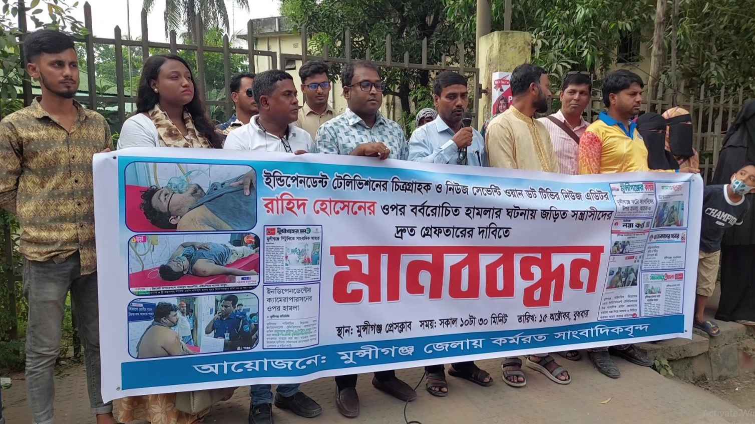 মুন্সিগঞ্জে ইন্ডিপেনডেন্ট টেলিভিশনের চিত্রগ্রাহক রাহিদ হোসেনের ওপর অতর্কিত সন্ত্রাসী হামলার ঘটনায়,জড়িতদের দ্রুত গ্রেফতার করে আইনের আওতায় এনে, বিচারের দাবিতে ঘণ্টা ব্যাপী মানববন্ধন কর্মসূচি পালন করেছেন স্থানীয় গণমাধ্যম কর্মীরা।