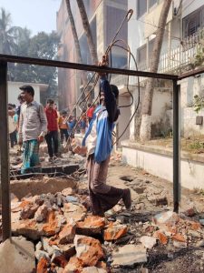 এক্সকাভেটরের সঙ্গে রড ও হাতুড়ি নিয়ে লোকজন সকাল ৭টা থেকে সকাল ৯টা পর্যন্ত ভাঙার কাজ চালিয়ে যায়।