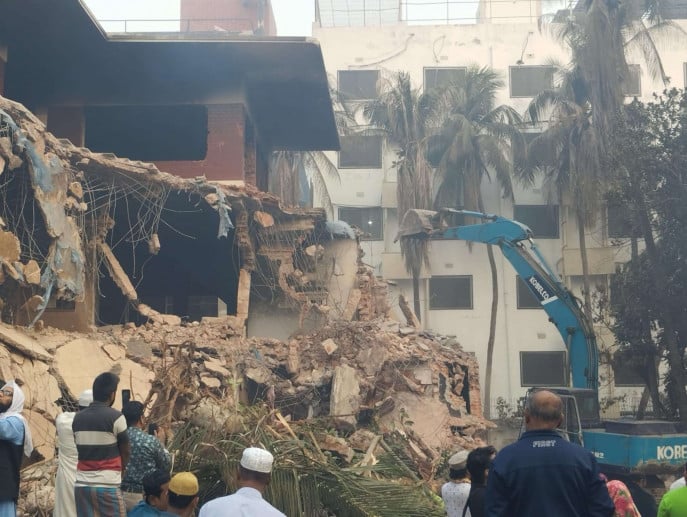এক্সকাভেটরের সঙ্গে রড ও হাতুড়ি নিয়ে লোকজন সকাল ৭টা থেকে সকাল ৯টা পর্যন্ত ভাঙার কাজ চালিয়ে যায়।