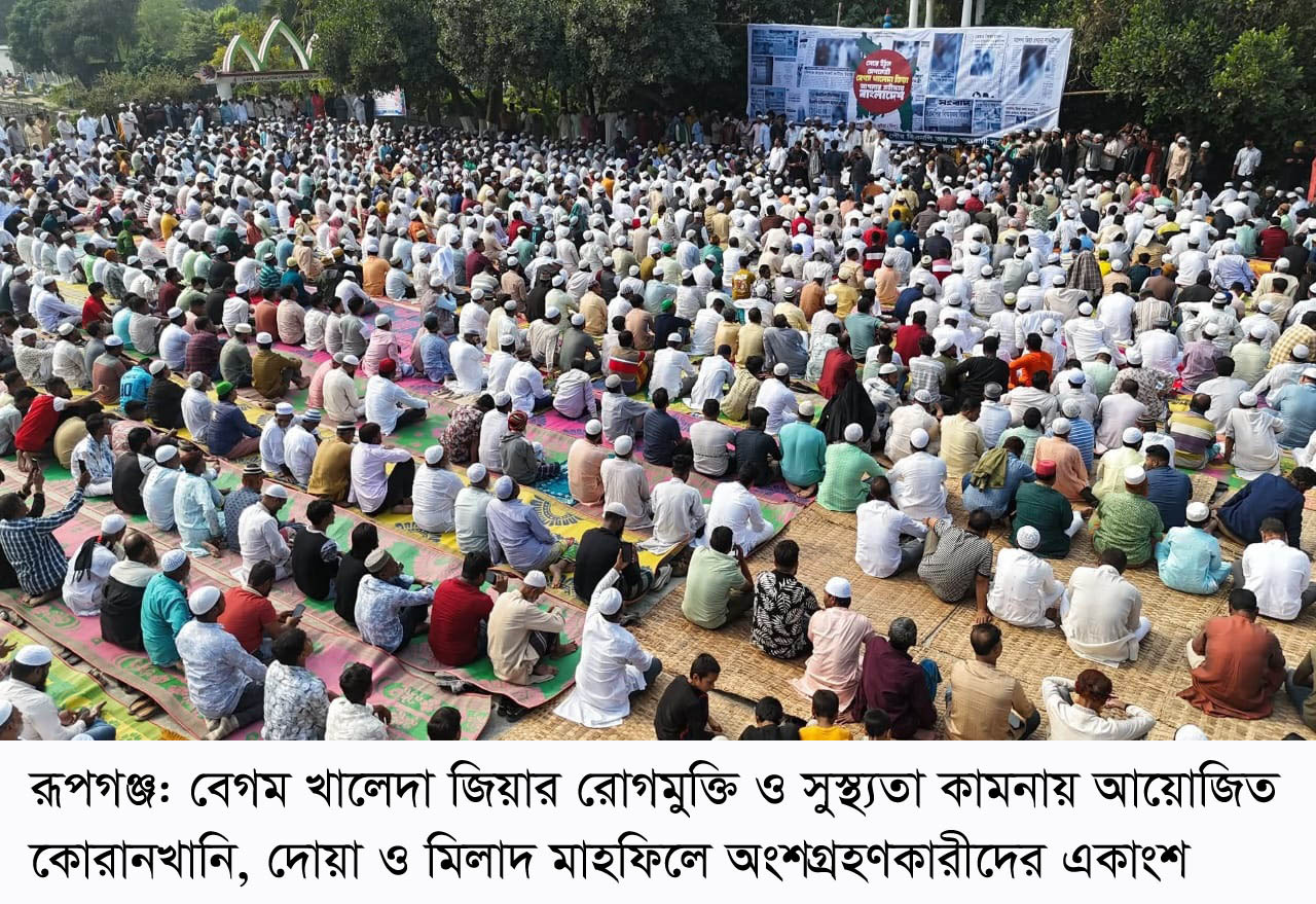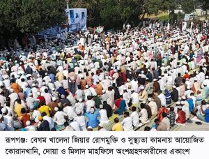 সাবেক প্রধানমন্ত্রী ও বিএনপির চেয়ারপার্সন দেশনেত্রী বেগম খালেদা জিয়ার রোগমুক্তি ও সুস্থ্যতা কামনায় নারায়ণগঞ্জের রূপগঞ্জ উপজেলা বিএনপি কোরআনখানি, দোয়া ও মিলাদ মাহফিলের আয়োজন করে। গতকাল ১ডিসেম্বর সোমবার উপজেলা বিএনপি, অঙ্গ ও সহযোগী সংগঠনের উদ্যোগে ভুলতা পাড়াগাঁও ঈদগাহ মাঠে আয়োজিত অনুষ্ঠানে লাখো মানুষ অংশ নেয়।