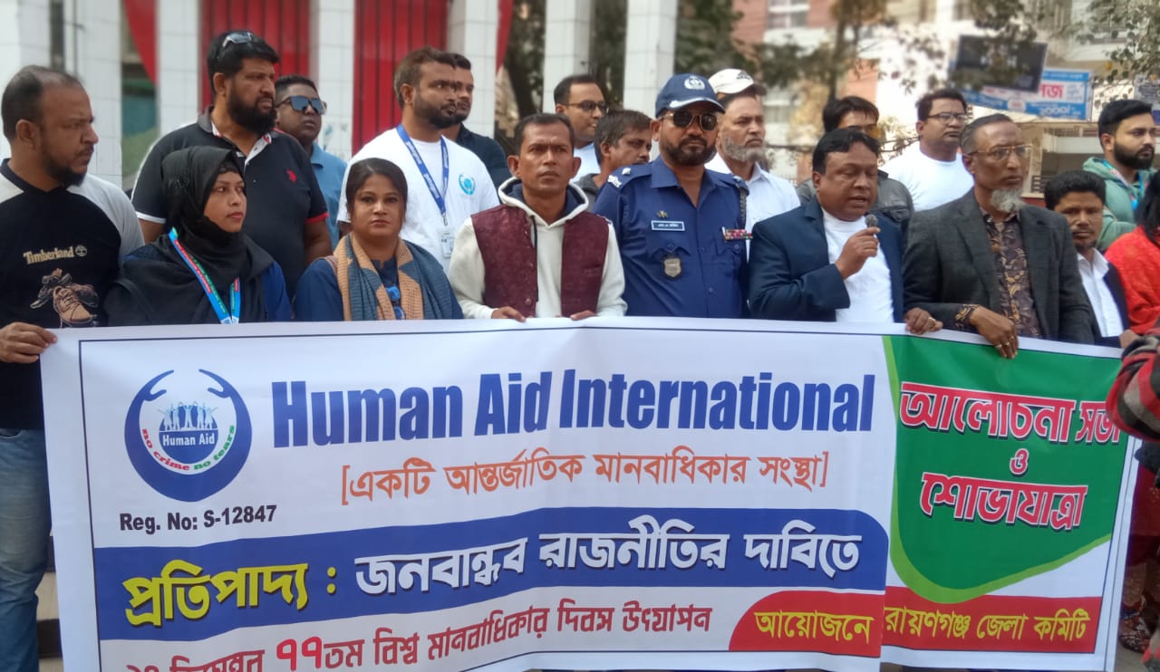 হিউম্যান এইড ইন্টারন্যাশনাল নারায়ণগঞ্জ জেলা শাখার সভাপতি এড.সাহিদুল ইসলাম টিটু’র সভাপতিত্বে ও সংগঠনের সাধারণ সম্পাদক এস,এম,জহিরুল ইসলাম বিদ্যুৎ এর সার্বিক তত্বাবধানে ১০ ডিসেম্বর বুধবার সকাল ৯.৩০ মিনিটে নারায়ণগঞ্জ শহরের চাষাঢ়া জিয়া হল প্রাঙ্গণ থেকে সংগঠনের নেতৃবৃন্দদের উপস্থিতিতে একটি শোভাযাত্রা নিয়ে কেন্দ্রীয় শহিদ মিনারে গিয়ে শেষ হয় এবং শহিদ মিনার প্রাঙ্গণে আলোচনা সভা অনুষ্ঠিত হয়।