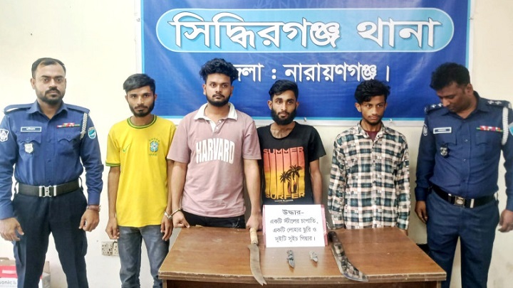 সিদ্ধিরগঞ্জে বিশেষ অভিযানে চারজনকে গ্রেপ্তার করেছে পুলিশ। অভিযানের সময় তাদের কাছ থেকে চাপাতি, ছুরি ও সুইচ গিয়ারসহ চারটি ধারালো অস্ত্র উদ্ধার করা হয়েছে।