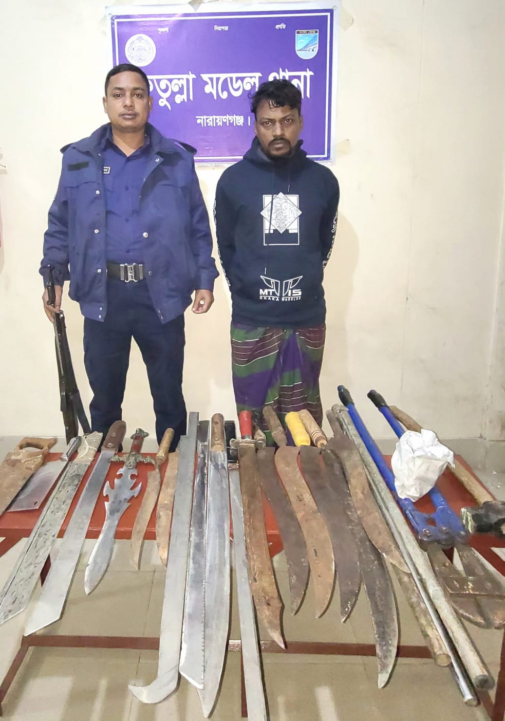 আসন্ন ত্রয়োদশ জাতীয় সংসদ নির্বাচনকে কেন্দ্র করে নারায়ণগঞ্জ জেলার সুযোগ্য পুলিশ সুপার জনাব মোহাম্মদ মিজানুর রহমান মুন্সী মহোদয়ের নির্দেশনায় চিহ্নিত অস্ত্রধারী ও সন্ত্রাসীদের গ্রেফতারের লক্ষ্যে অভিযান অব্যাহত রয়েছে। এরই ধারাবাহিকতায় অদ্য ০৬ জানুয়ারি (মঙ্গলবার) ২০২৬ খ্রি. বেলা ১৫.০০ ঘটিকা থেকে ১৭.০০ ঘটিকা পর্যন্ত ফতুল্লা থানার অফিসার ইনচার্জ জনাব মোঃ আব্দুল মান্নান এর নেতৃত্বে এসআই (নিঃ)/মোঃ রফিক, বিপিএম; এসআই (নিঃ)/শামীম হোসাইন; এসআই (নিঃ)/মিজান, এসআই (নিঃ)/মিলন ফকির; এএসআই (নিঃ) শরিফুল সঙ্গীয় ফোর্সসহ ফতুল্লা থানার গলাচিপা এলাকার কুখ্যাত সন্ত্রাসী মোঃ জাহিদ হোসেন এর বাড়িতে বিশেষ অভিযান পরিচালনা করে। অভিযান পরিচালনা করে কুখ্যাত অপরাধী ও চিহ্নিত সন্ত্রাসী হিসেবে পরিচিত জাহিদ হোসেন এর সহযোগী মোঃ মনির হোসেন ওরফে ফাইটার মনির(৪০), পিতাঃ মোঃ সাইদুর রহমান, মাতাঃ পারভীন বেগম, সাং- মাসদাইর, থানাঃ ফতুল্লা, জেলাঃ নারায়ণগঞ্জকে গ্রেফতার করে। অতঃপর গ্রেফতারকৃত আসামি মোঃ মনিরের দেখানো মতে উক্ত বাড়ি হতে ১। স্টিলের বড় ছোড়া-০২টি, ২। হাতল ছাড়া স্টিলের রামদা-০১ টি, ৩। বড় দা-০৩ টি, ৪। ডেগার-০১ টি, ৫। সামুরাই-০১ টি, ৬। বড় ছোরা- ০৬ টি, ৭। ছোট ছোড়া-০২ টি, ৮। চাপাতি বড়-০১ টি, ৯। চাপাতি ছোট-০১ টি, ১০। করাত-০১ টি, ১১। হাতুড়ি বড়- ০১ টি, ১২। লোহা কাটার-০১ টি, ১৩। পাইপ-০৩টি