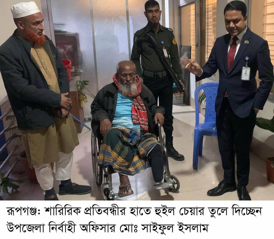 বিশ্ব প্রতিবন্ধী দিবস উপলক্ষে নারায়ণগঞ্জের রূপগঞ্জ উপজেলার মুড়াপাড় ইউনিয়নের মাছিমপুর গ্রামের হতদরিদ্র শারিরিক প্রতিবন্ধী নাছির উদ্দিন ভুঁইয়াকে(৬৮) হুইল চেয়ার উপহার দেওয়া হয়েছে। গত ১৫জানুয়ারি বৃহস্পতিবার বিকেলে নাছির উদ্দিন ভুঁইয়ার হাতে রূপগঞ্জ উপজেলা নির্বাহী অফিসার মোঃ সাইফুল ইসলাম তার ব্যাক্তিগত তহবিল থেকে তিনি এ উপহার তুলে দেন।