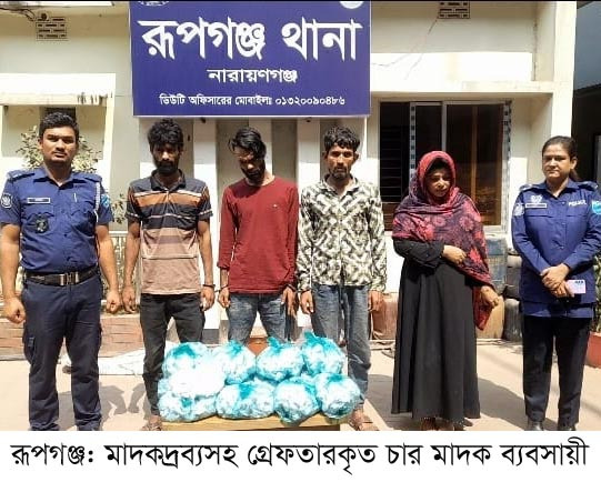 নারায়ণগঞ্জের রূপগঞ্জ উপজেলার কায়েতপাড়া ইউনিয়নের চানপাড়া পুনর্বাসন কেন্দ্র এলাকায় মাদক ও অপরাধ দমনে অভিযান পরিচালনা করেছে রূপগঞ্জ থানা পুলিশ। গত ৪মার্চ বুধবার রাত ১২টা থেকে রাত ৩টা পর্যন্ত পরিচালিত এ অভিযানে ৪ কেজি ২০০ গ্রাম গাঁজাসহ চার মাদক ব্যবসায়ীকে গ্রেফতার করা হয়েছে। গ্রেফতারকৃতরা হলেন চানপাড়া পুনর্বাসন কেন্দ্র এলাকার বরকত উল্লাহর ছেলে তানজিল হোসেন(২৫), বেলায়েত হোসেনের ছেলে ইব্রাহিম মিয়া(২৮), গিয়াস উদ্দিনের ছেলে তপন মিয়া(২৯) ও ইমন মিয়ার স্ত্রী জ্যোতি আক্তার(২০)।